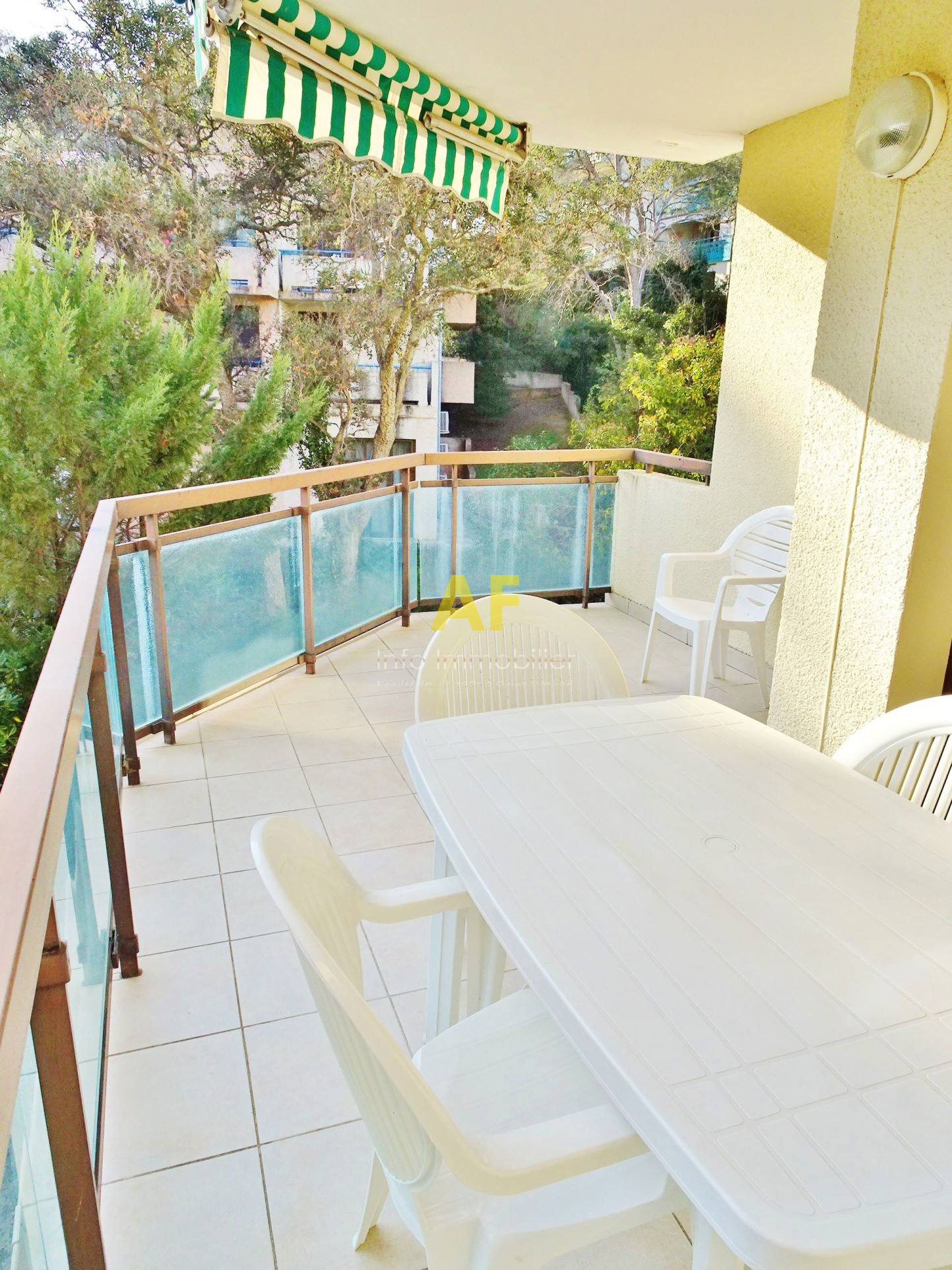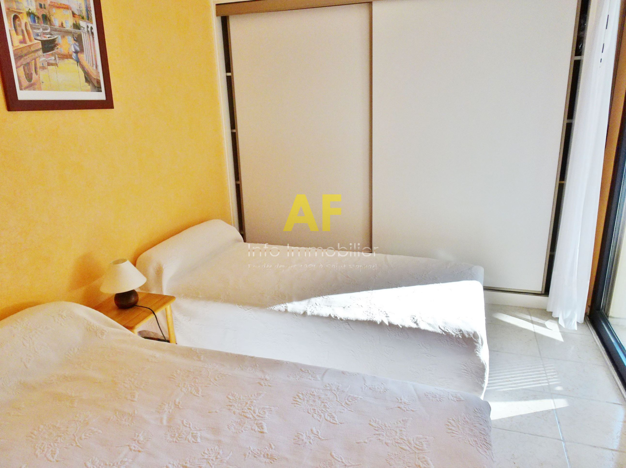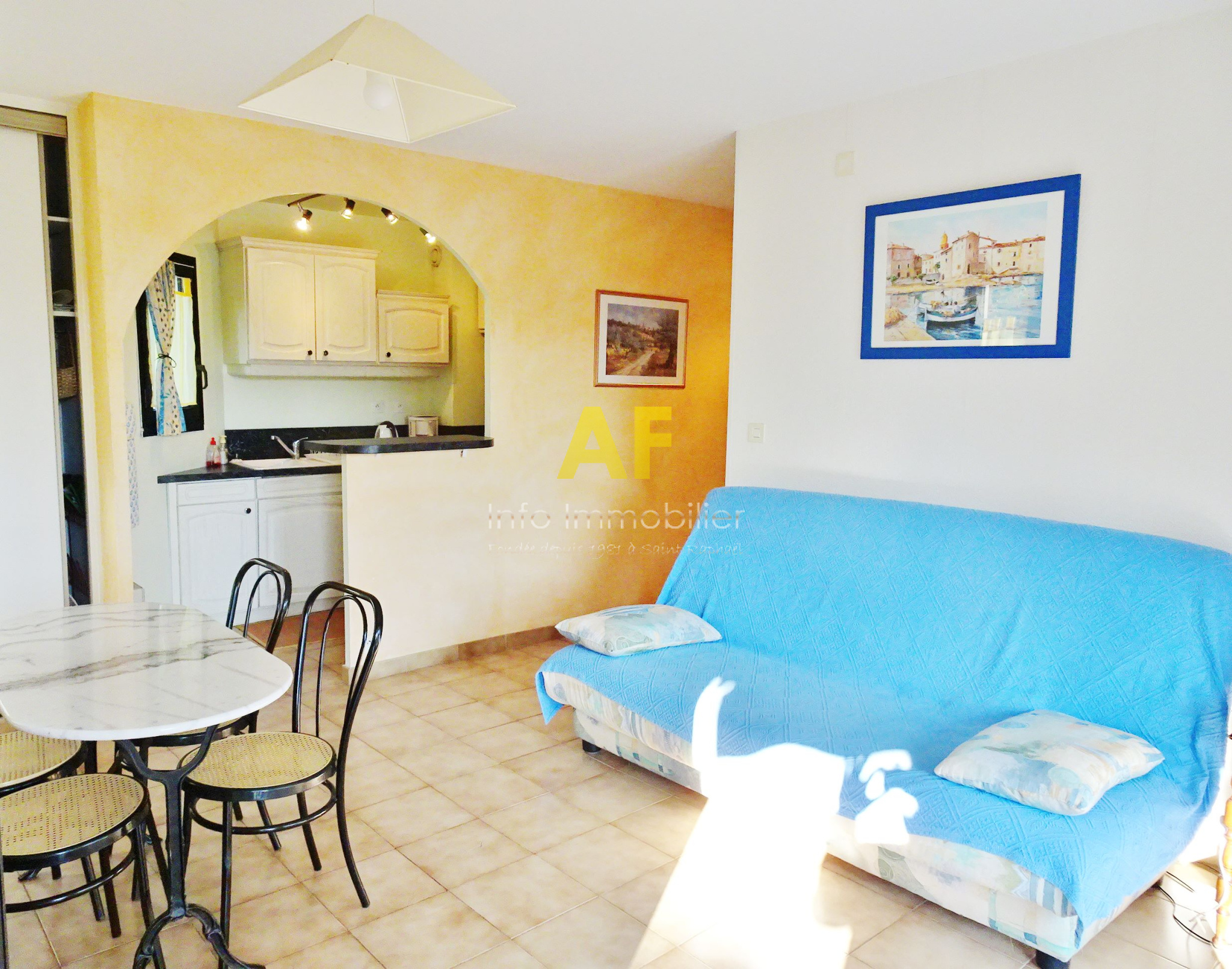 Saint-Raphaël (83700)EXCLUSIVITE - SAINT RAPHAEL, quartier de Boulouris, très agréable appartement d'angle de type 2 pièces + terrasse composé d'un hall d'entrée, séjour avec placard ouvrant sur belle terrasse exposition Sud et Ouest, Kitchenette équipée, chambre avec placard ouvrant sur terrasse, salle de bains avec fenêtre, wc séparé. Le tout dans une petite résidence de standing sécurisée parfaitement au calme, située à 300m de tous les commerces et à proximité de la mer à pied. Grand garage en sous-sol. Copropriété composée de 63 lots (y compris stationnement) dont seulement 28 lots principaux d'habitation. Charges courantes annuelles : 1258 €