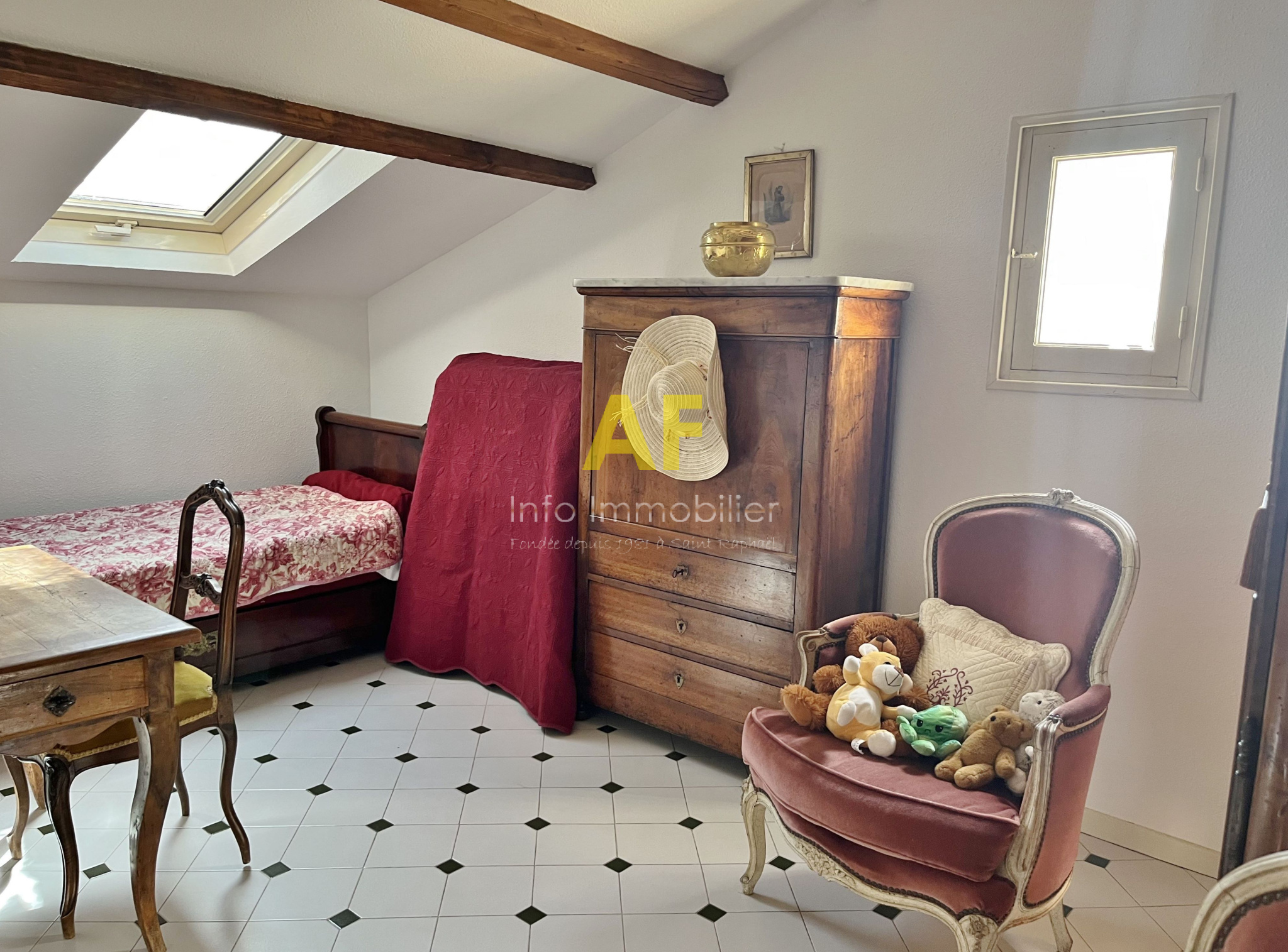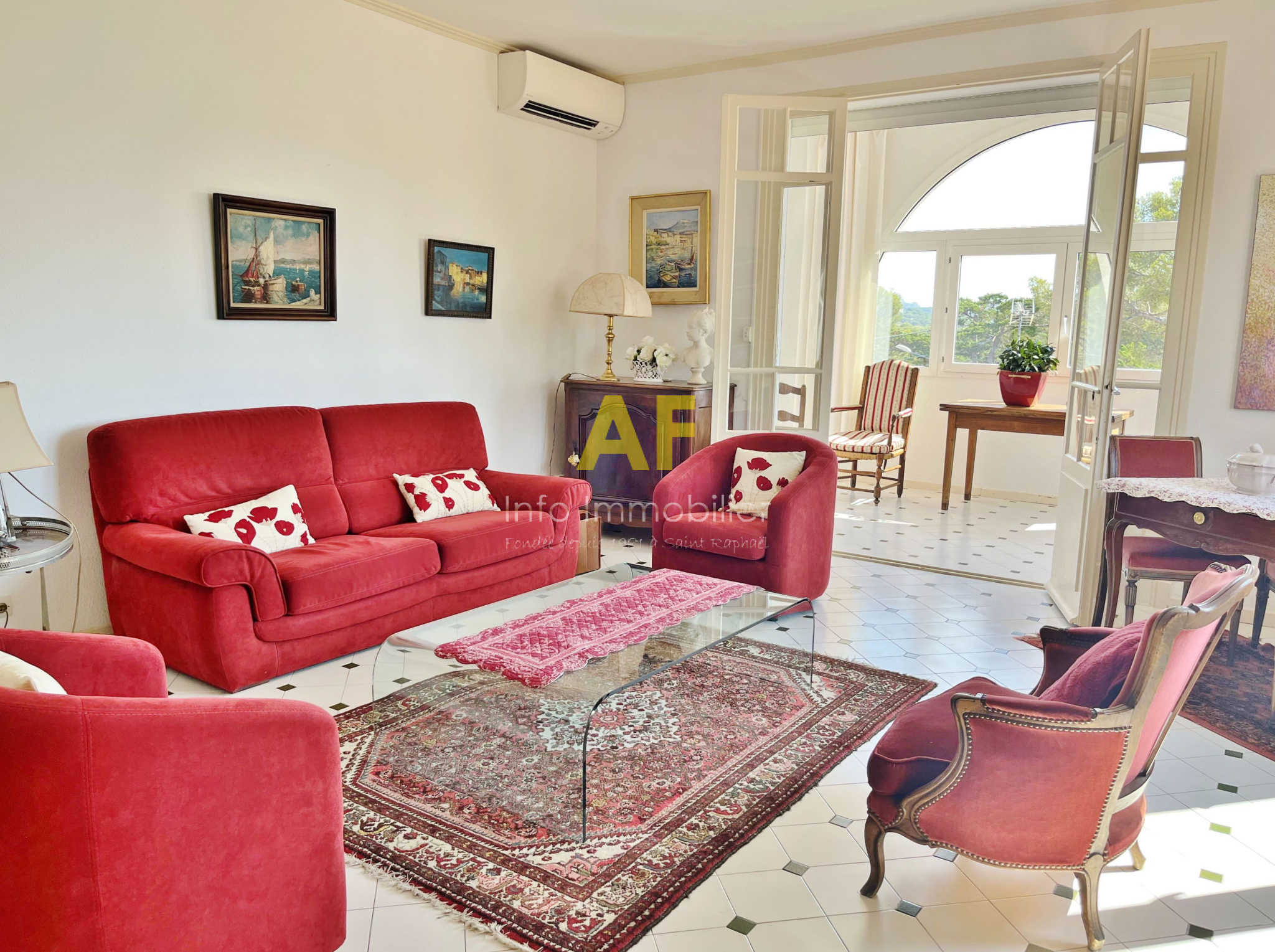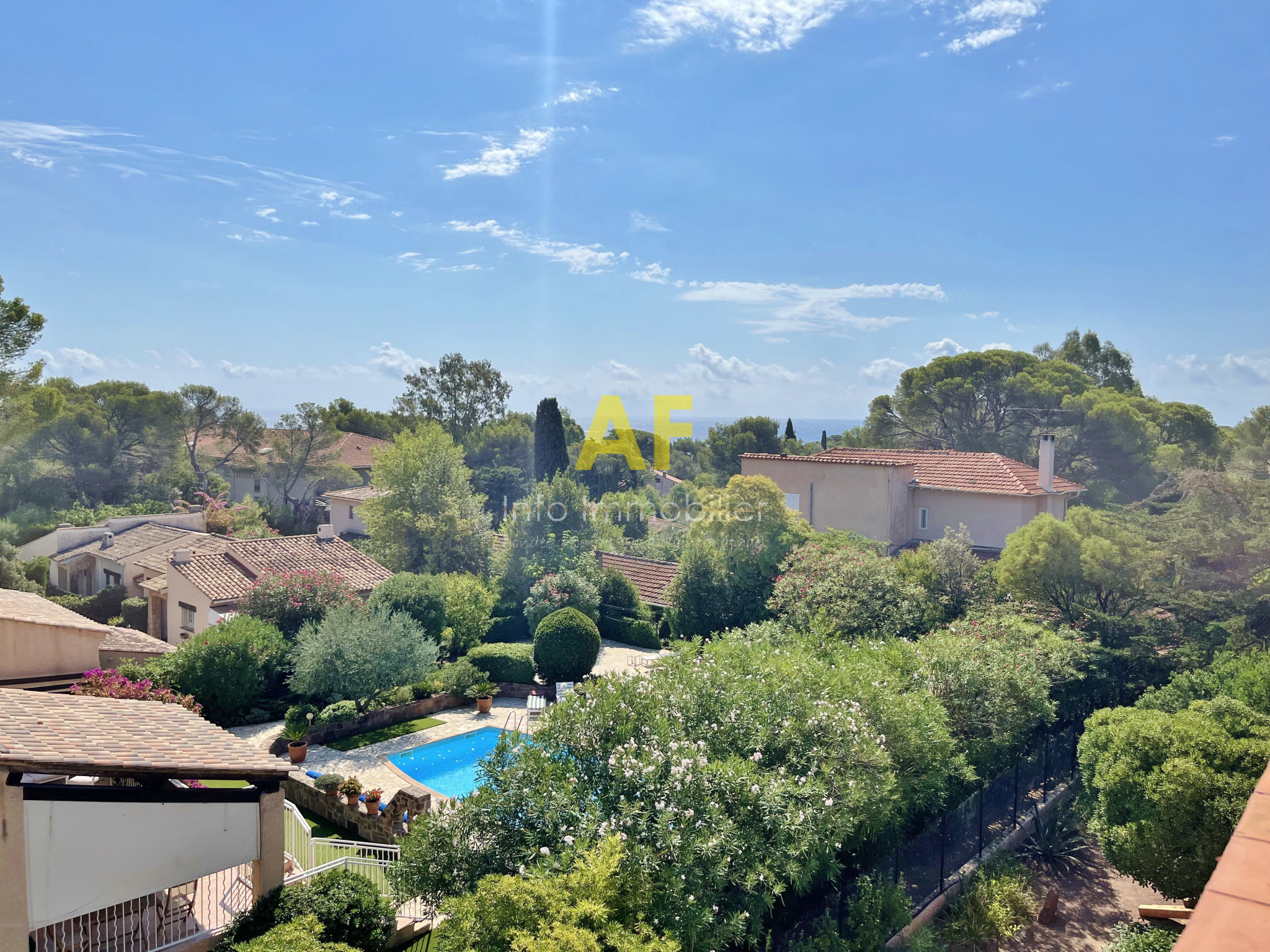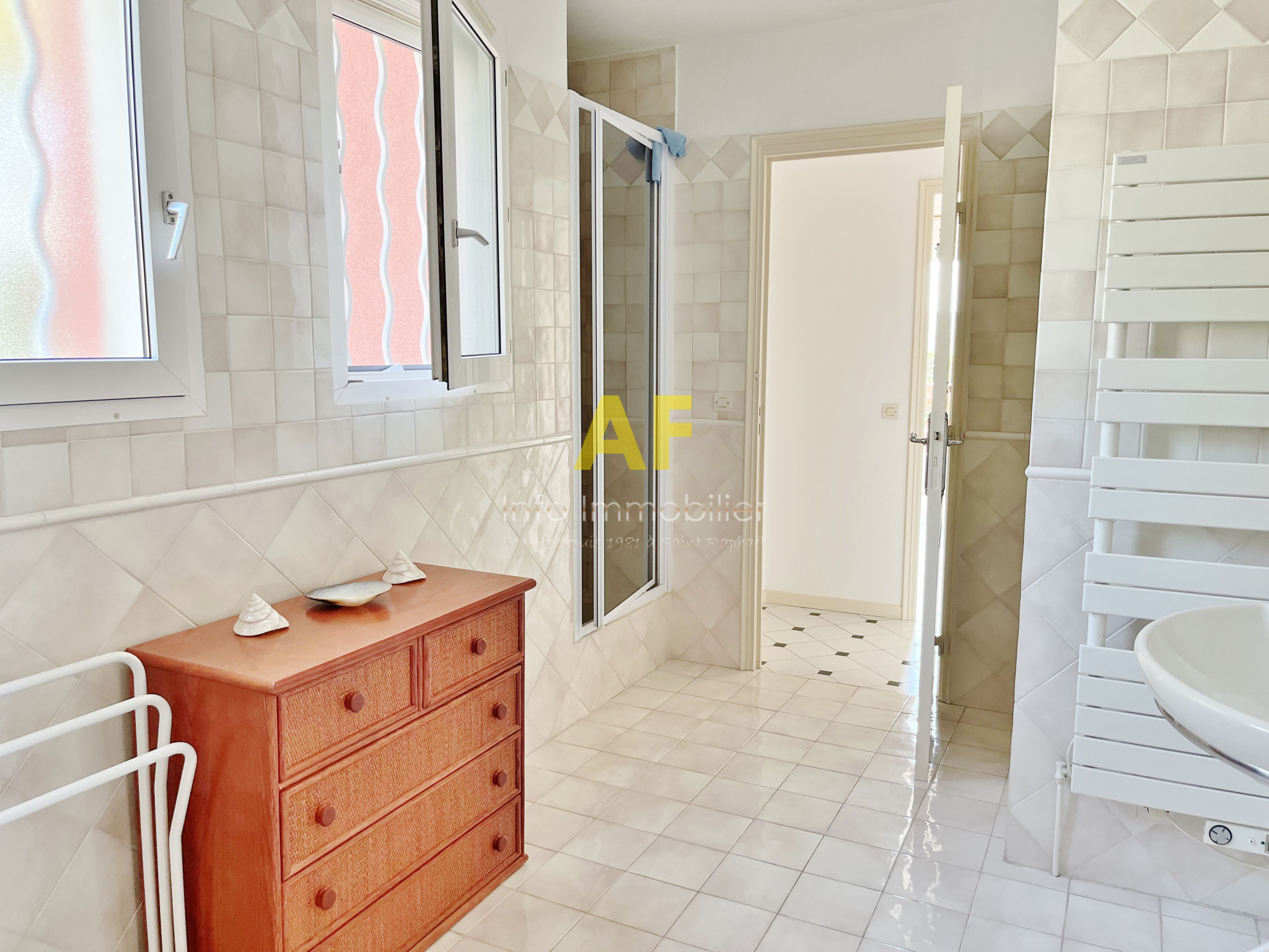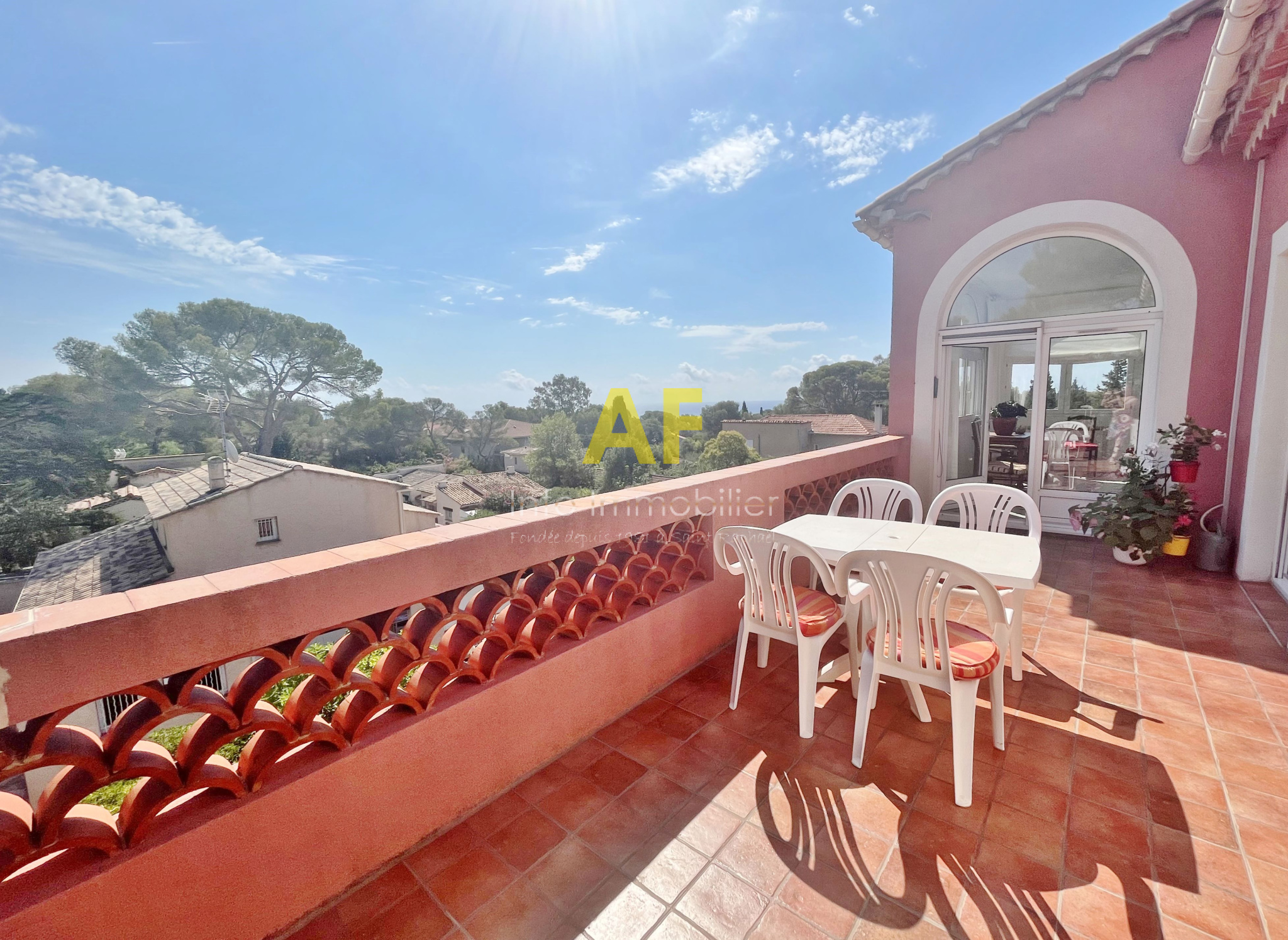 Saint-Raphaël (83700)Saint Raphaël, dans quartier très résidentiel et au calme, confortable appartement de type 4 pièces + terrasse et terrasse couverte - dernier étage - bénéficiant d'une belle vue dégagée jusquà la mer, dans petite copropriété de seulement deux étages. L'appartement, seul à son niveau, se compose d'un hall d'entrée, séjour salon ouvrant sur une agréable terrasse couverte de 12m² bénéficiant d'une jolie vue jusqu'à la mer, une vaste cuisine avec coin repas et cellier attenant, dégagement avec placard, 2 belles chambres de 13m² et 15m² chacune ouvrant toutes les deux sur une terrasse de 17m², grande salle de bains avec double vasques et fenêtres, wc avec fenêtre, ainsi qu'une dernière chambre/bureau. Appartement traversant bénéficiant d'une triple exposition. Chauffage central individuel + climatisation réversible. Volet roulant électrique. Porte Blindée.Une cave de 6m² ainsi qu'un emplacement de parking couvert complètent ce bien. Le tout situé tout proche du Parc Santa Lucia et du port, dans une petite copropriété composée de 17 lots (y compris stationnements et caves) dont seulement 4 lots principaux d'habitation. Charges courantes annuelles : 1060 € - Taxe Foncière 1541 €