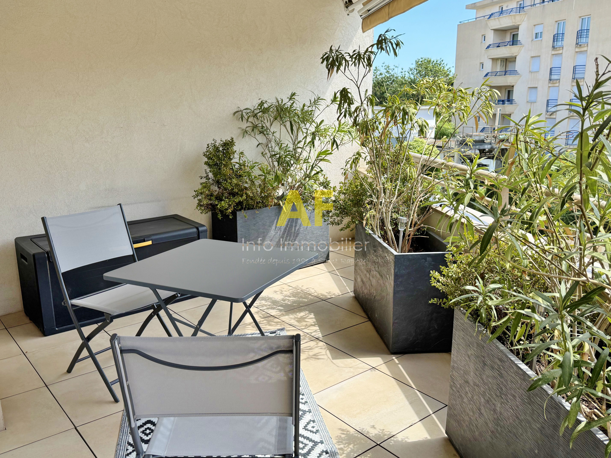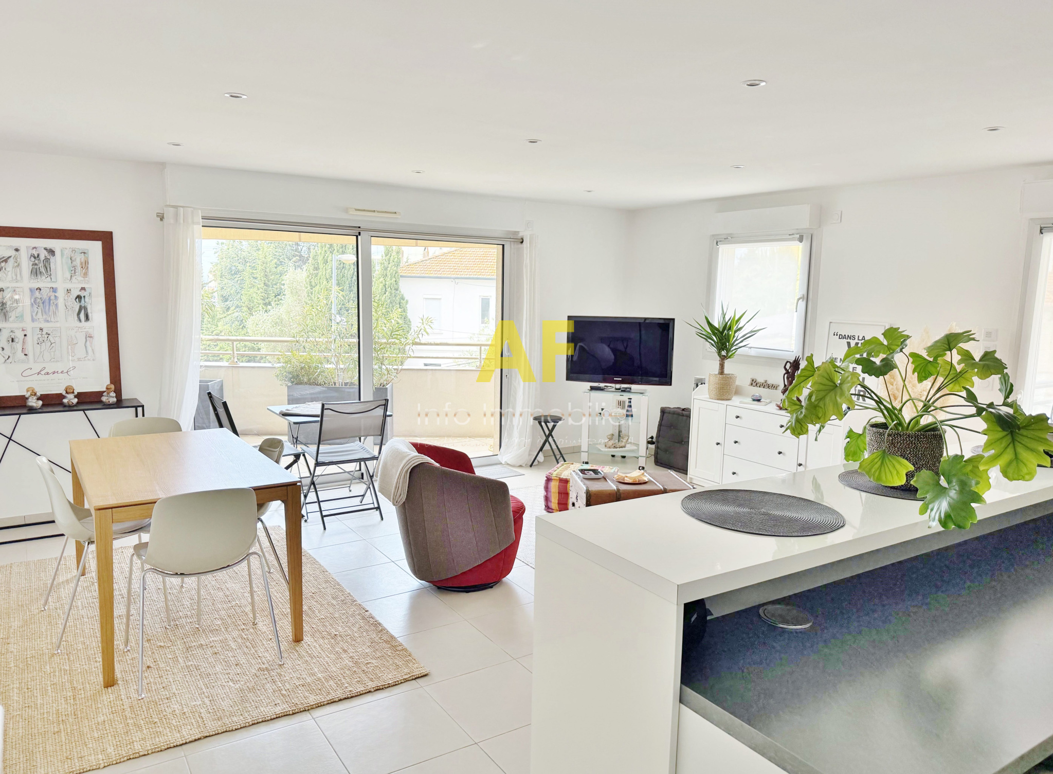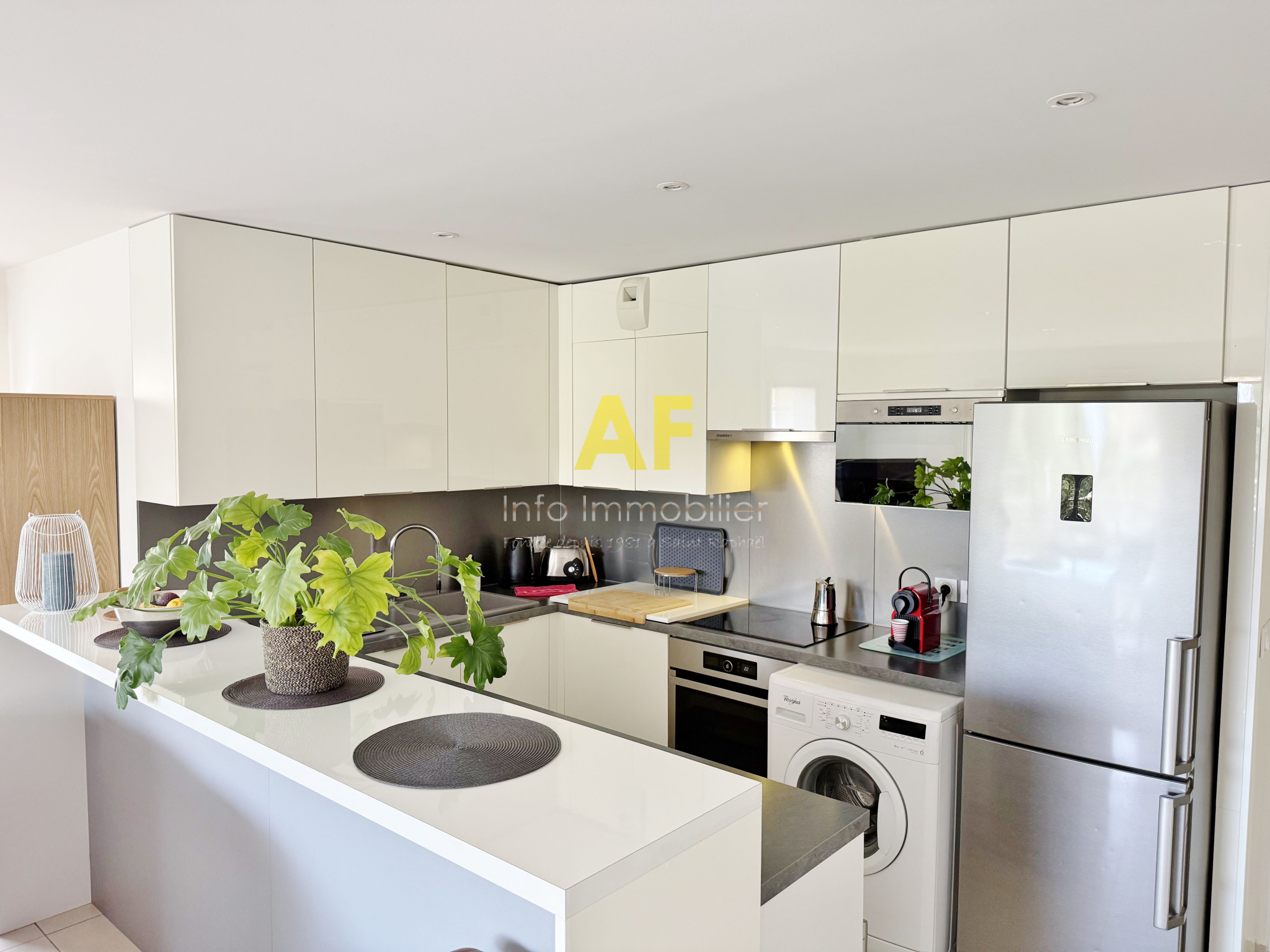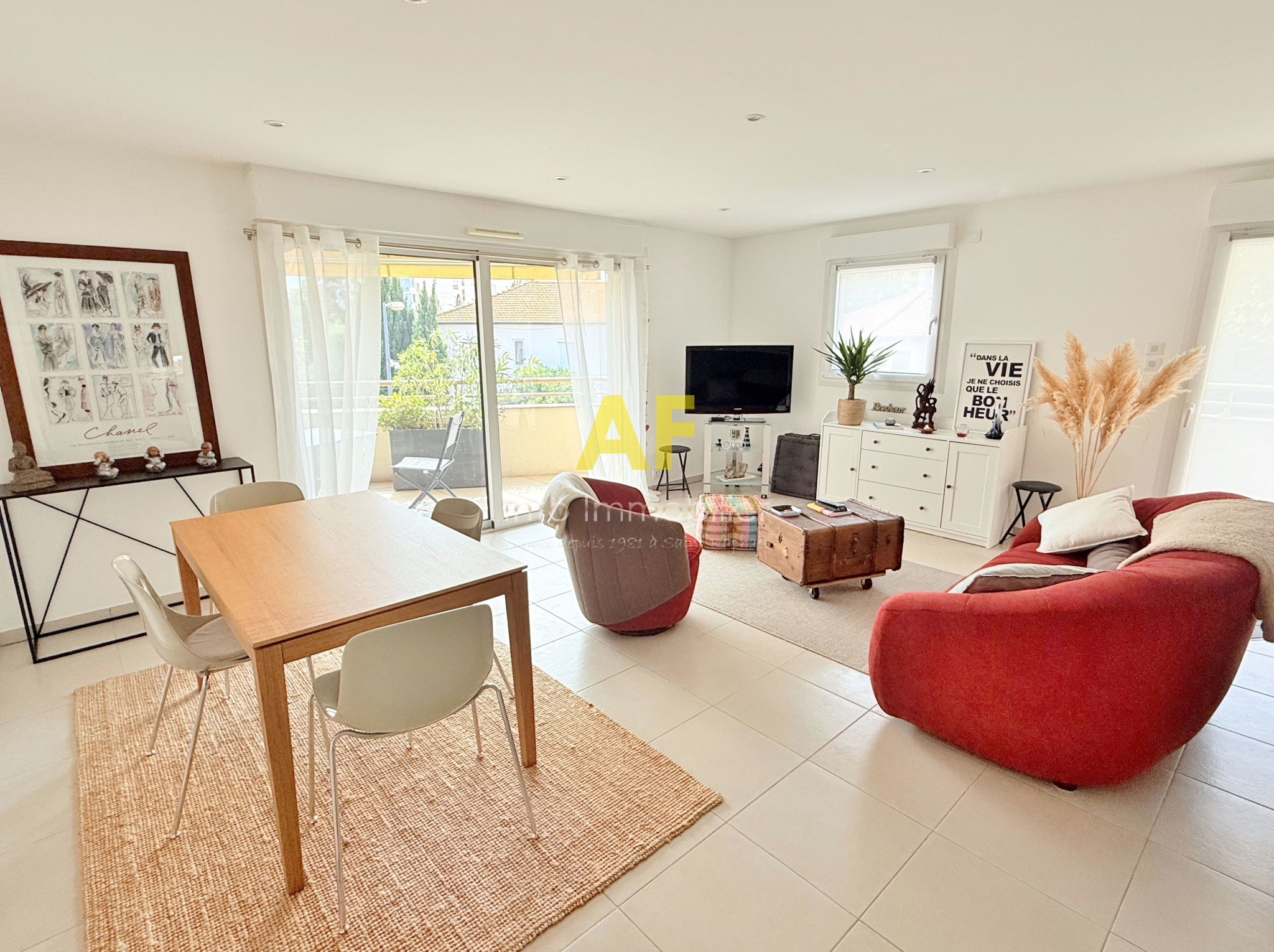 Fréjus (83600)Fréjus, limite Saint Raphaël, à seulement 400m des plages et des premiers commerces à pied, confortable appartement 3 pièces 74m² avec terrasse expo Sud, le tout en parfait état et aménagé avec goût. Ce logement aux prestations de standing se compose d'un hall d'entrée avec placard, un wc invité avec lave mains, un séjour salle à manger ouvrant sur terrasse avec jolie cuisine américaine aménagée et équipée, un dégagement avec placards desservant une chambre principale de 12m² avec placard et salle de bains attenante avec wc, une seconde chambre avec sa salle d'eau attenante. Cet appartement bénéficie également d'un système de climatisaion réversible dans chaque pièce de vie ainsi que de volets roulants et d'un store électrique sur terrasse. La résidence sécurisée, récente et très bien entretenue satisfait les dernières normes thermiques et phoniques en vigueur. 2 places de parking privatifs sont également vendues avec l'appartement et sont incluses dans le prix de vente. Copropriété composée de 28 lots (y compris stationnements) dont seulement 10 lots principaux d'habitation. Charges courantes annuelles : 1665 €