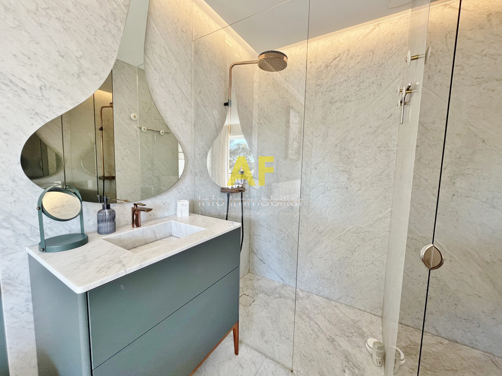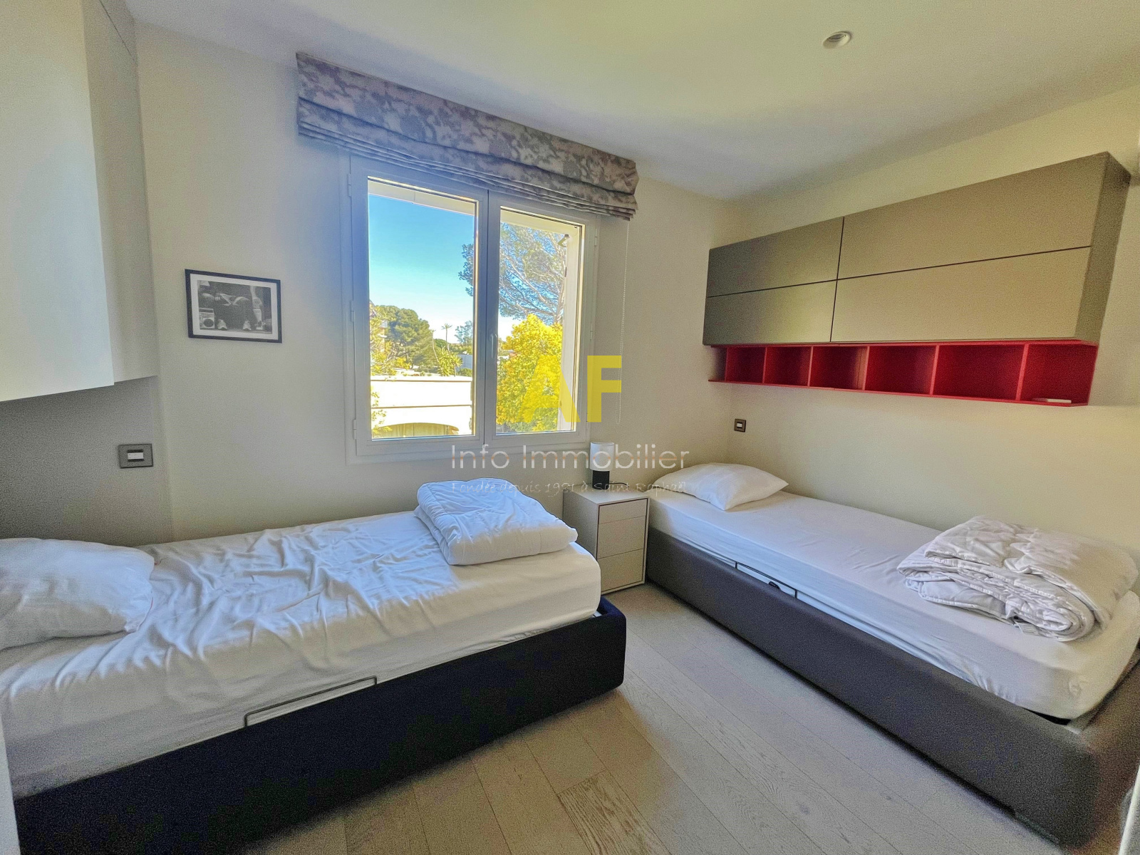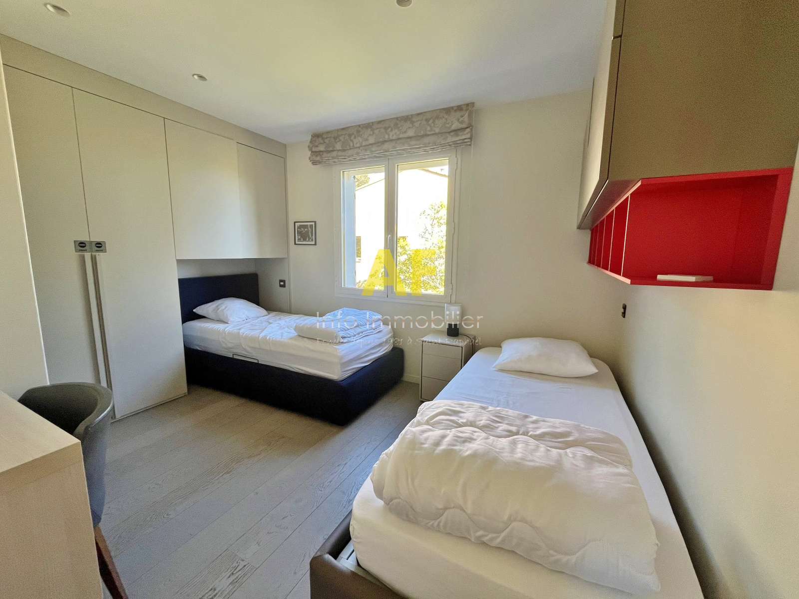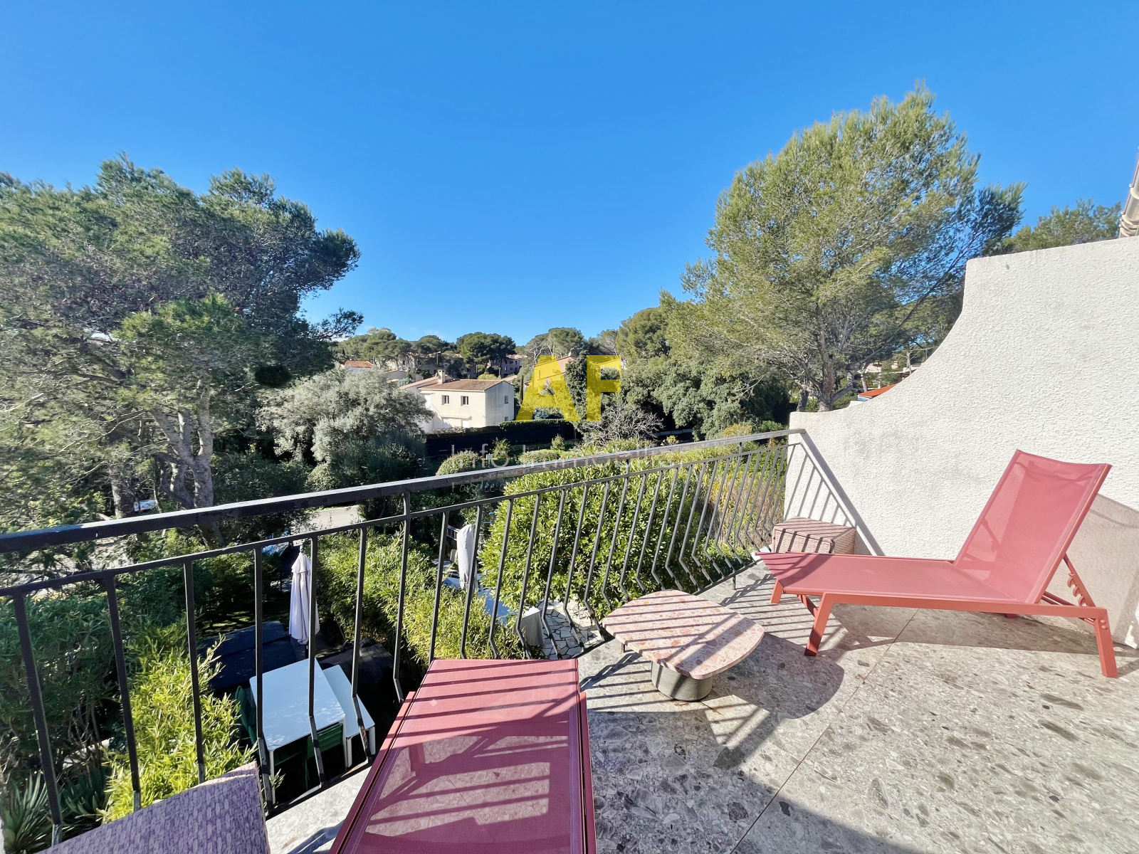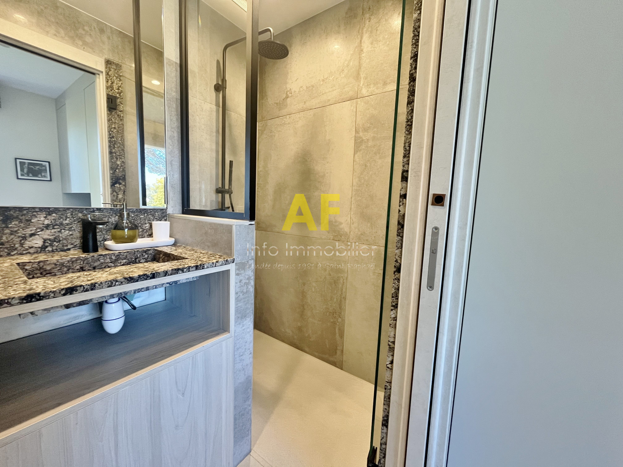 - Une seconde chambre d’environ 15 m², entièrement aménagée, disposant de sa salle d’eau privative et ouvrant sur une terrasse d’environ 8 m² avec vue dégagée sur la pinède